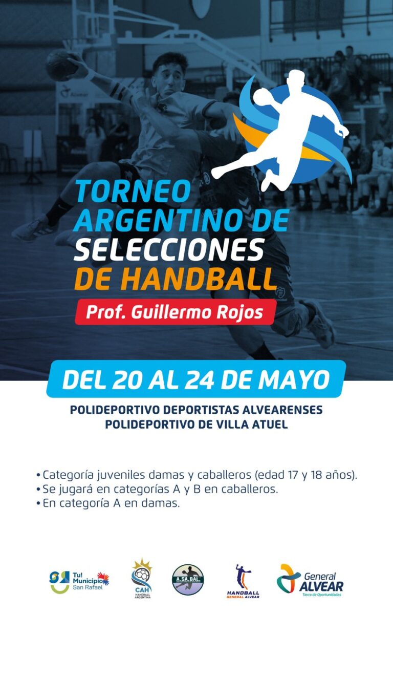 Del 20 al 24 de este mes en General Alvear y Villa Atuel se disputará el Torneo Argentino de selecciones de handball, evento que será organizado por la Asociación Sanrafaelina de balonmano y fiscalizado por la Confederación Argentina de Handball.